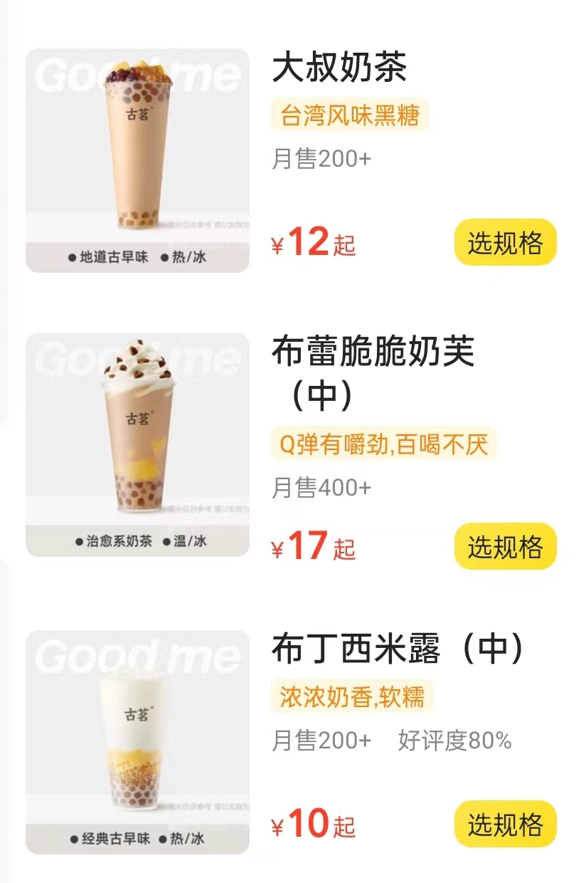 其中大叔奶茶12元,布蕾脆脆奶芙17元,布丁西米露10元,